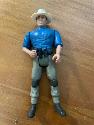 Figura de acción del personaje Alan Grant de la película Jurassic Park, lanzada en 1993. - Figura con sombrero blanco. - Camisa azul con insignia. - Pantalones caqui. - Cinturón con accesorios.