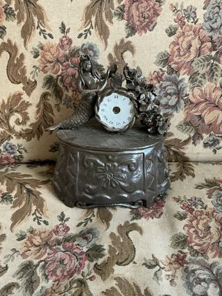 Figura decorativa de barro esmaltado con sirena y un reloj. Medidas: alto 29cm, ancho 25cm, fondo 20 cm. Se entrega en mano en Castelló de La Plana. 931