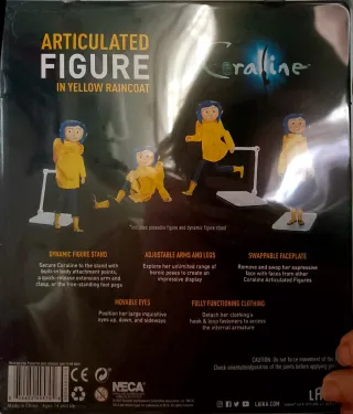Figura articulada de Coraline, la protagonista de la película, vestida con su icónico impermeable amarillo. - Figura articulada. - Incluye impermeable amarillo. - Apta para mayores de 14 años.