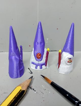 Figuras decorativas de mini nazarenos 4cm ideales para coleccionistas o para ambientar la Semana Santa. Realizadas con impresión 3D y detalles pintados a mano. - Diseño de nazarenos con túnica blanca y capirote morado, los gitanos, vera cruz.... varias hermandades con escudos personalizados. - Detalle de escudo y vela. 50ud/25€ 100ud/45€