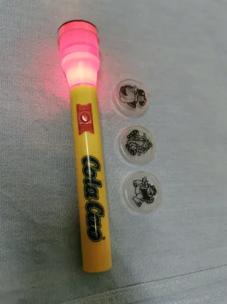 Antigua Linterna de Cola Cao año 2005, como se ve enciende bien.. A veces le cuesta x que el botón está duro.. Por lo demás como nueva.. - Incluye cuatro figuras transparentes con dibujos.