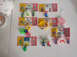 Conjunto de figuras coleccionables de Mario y Luigi, provenientes de Kinder Sorpresa. Incluye varios personajes y accesorios. - Figuras de Mario y Luigi. - Accesorios temáticos de Mario. - Elementos coleccionables de Kinder Sorpresa.