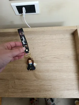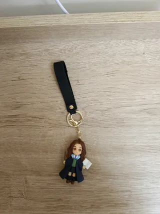 Llavero con una figura detallada de un personaje. - Figura de arcilla polimérica. - Incluye varita y libro. - Colgante con correa negra y anilla dorada.