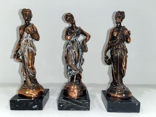Conjunto de tres figuras decorativas de estilo clásico. - Figuras de resina con acabado en bronce. - Bases de mármol negro. - 7 cm Las 3 a 25€ Si quieres una o dos solo también se puede.