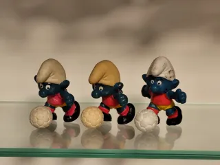 Conjunto de tres figuras de Pitufos jugando al fútbol. Cada figura tiene un pitufo con su propio balón. - Figuras de Pitufos. - Temática de fútbol. - Incluye tres balones.