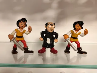 Conjunto de figuras de los Pitufos, incluyendo a Gargamel y dos pitufos. - Figuras de plástico. - Personajes: Gargamel y dos pitufos. - Incluyen espadas.