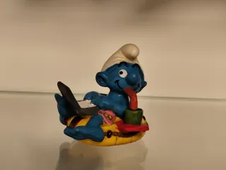 Figura decorativa de un Pitufo. Ideal para coleccionistas o fans de los Pitufos. - Pitufo azul con gorro blanco. - Sentado en un flotador amarillo y rojo. - Sostiene un portátil y bebe con una pajita.