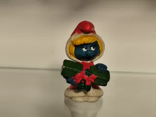 Adorable figura de Pitufina vestida para las fiestas, sosteniendo un regalo. - Diseño temático navideño. - Colores vivos: azul, rojo y blanco. - Detalle de lazo y hojas verdes en el regalo.
