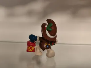Figura de colección de un Pitufo vestido con sombrero, chaleco y bufanda. Lleva un regalo verde con lazo rojo en una mano y un farolillo rojo y amarillo en la otra. - Detalle de sombrero marrón. - Chaleco rojo y bufanda. - Regalo envuelto. - Farolillo con detalles amarillos.