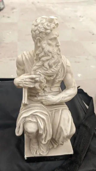 Figura decorativa de Moisés, inspirada en la escultura clásica. - Detallada representación de Moisés. - Diseño con túnica y barba característica. - Base sólida para exhibición.