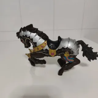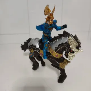 Figura de un caballero medieval montado en su caballo. La armadura del caballero es de color azul con detalles dorados y un casco con alas. - Caballo con armadura detallada en tonos oscuros y plateados. - Adornos dorados y rosas en la armadura del caballo. - Figura de caballero con casco y armadura azul.