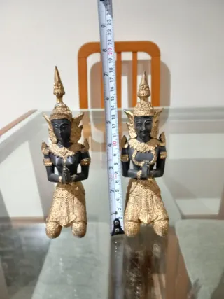 Conjunto de dos figuras decorativas de bronce con un diseño inspirado en el arte asiático. Estas piezas presentan una pose de reverencia y un atuendo detallado. - Material: Bronce - Color: Negro y dorado - Estilo: Asiático - Cantidad: 2 unidades