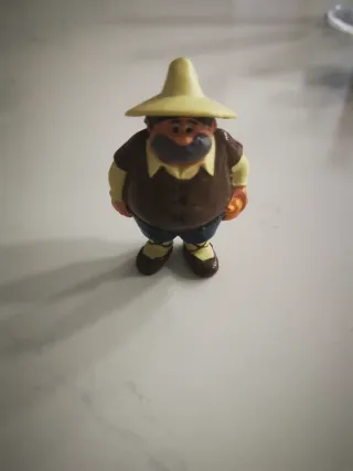 Figura del personaje Sancho Panza. - Sombrero amarillo. - Chaleco marrón. - Pantalones azules. - Zapatos marrones y amarillos.