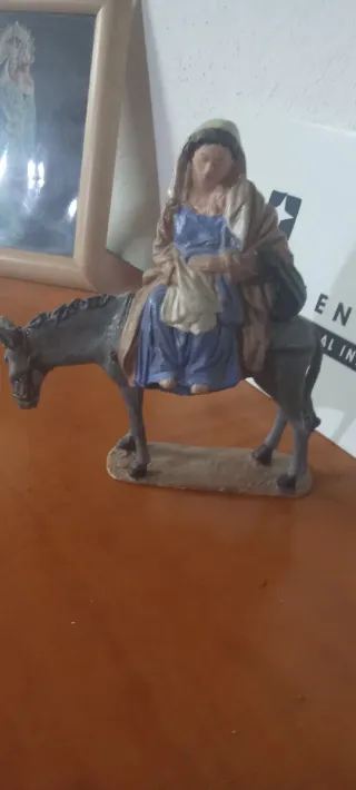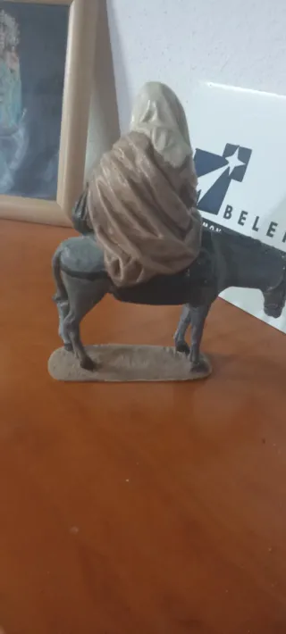 Figura para belén de 21 cm. - Representación de una persona montada en un burro. - Tonos tierra y grises.de marmolina pintada a mano