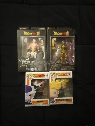 Lote de figuras de Dragon Ball Z. - Figura Dragon Stars Majin Buu. - Figura Dragon Stars Golden Frieza. - Funko Pop! Frieza (619). - Funko Pop! Super Saiyan Trunks (1281).