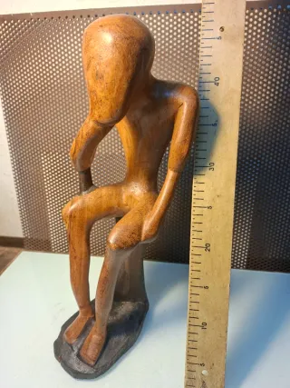 Figura decorativa africana de madera con forma humana, representando a una persona en actitud pensativa. Su diseño abstracto y material natural la hacen una pieza única. - Material: Madera en una única pieza. - Acabado: Natural - 45cm de longitud y 1,65kg de peso.