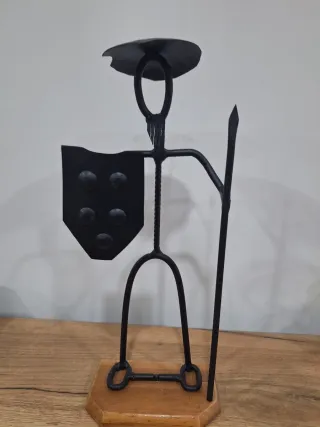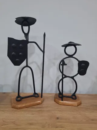 Conjunto de dos figuras decorativas de forja, representando a Don Quijote y Sancho Panza - Fabricadas en metal negro. - Bases de madera. - Diseño artesanal.