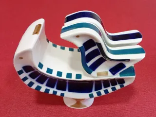 Esta pieza es una figura de porcelana de Sargadelos que representa a una pareja de aves, comúnmente descrita como una hembra con su polluelo. Sargadelos es una reconocida firma de cerámica española, concretamente de Galicia, famosa por sus diseños geométricos en blanco y azul cobalto. La pieza presenta el estilo clásico de la marca con motivos geométricos en azul cobalto, verde y oro sobre la porcelana blanca. Mide 18 cm de ancha por 17 cm de alta