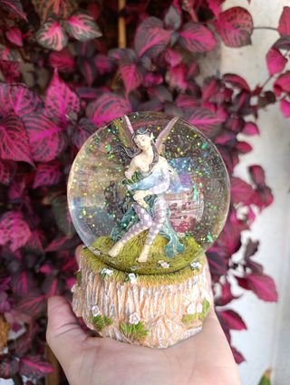 Bola de cristal decorativa con una figura de hada en su interior. Contiene purpurina que se mueve al agitarla. - Figura de hada detallada. - Base decorada con motivos naturales. - Efecto de purpurina brillante.