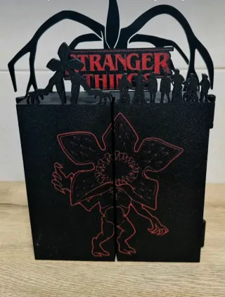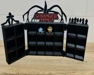 Expositor personalizado para figuras Funko Pop de Stranger Things. Ideal para coleccionistas. - Diseño inspirado en la serie. - Compartimentos etiquetados con nombres - Estructura negra con detalles temáticos.
