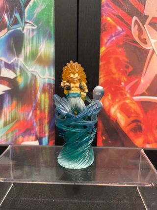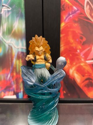 Figura de colección de Dragon Ball Z, representando a Gotenks en Super Saiyan 3. - Detallada figura de PVC. - Base con efecto de energía azul. - Ideal para fans de la saga.