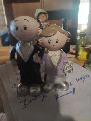 Conjunto de tres figuras decorativas. - Figuras de pareja vestidas de ceremonia. - Incluye ramo de flores plateado.