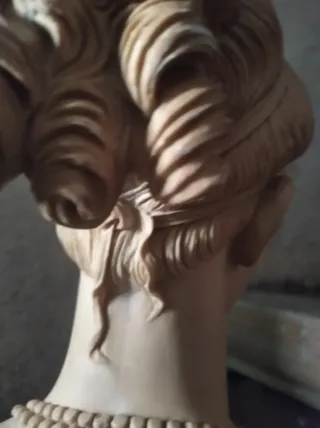 Elegantes figuras decorativas de dos mujeres de los años 70. Con un diseño clásico y detallado. - Base oscura. - Cuello con volantes y estampado. - Peinado recogido. (La segunda figura tiene un poquito de quemado de una estufa, pero apenas se nota)