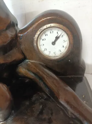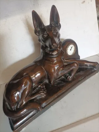 Figua antigua con forma de perro y un reloj integrado. Una pieza decorativa con un diseño clásico. El reloj es de carga manual y funciona . - Figura de perro detallada. - Reloj de esfera redonda.