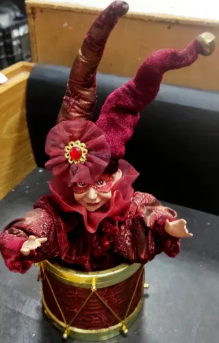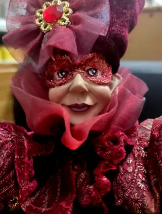 Figura decorativa de Arlequín con traje veneciano. Va con cuerda, mueve la cabeza y música. - Máscara roja brillante. - Adornos dorados y pedrería. - Tela de terciopelo y tul.