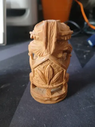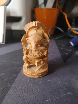 Pequeña figura tallada en madera que representa a Ganesha, la deidad hindú con cabeza de elefante. - Material: Madera. - Diseño detallado.