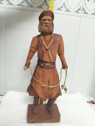 Figura artesanal de madera tallada que representa a un gaucho. Una pieza de arte popular con gran detalle. Posible recuerdo de Argentina - Material: Madera. - Técnica: Tallado a mano. - Estilo: Arte popular tradicional. Parece que le falta la mano dcha.