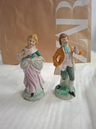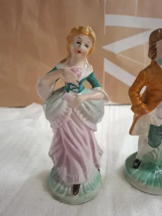 Conjunto de dos figuras de porcelana con un diseño clásico. - Figura femenina con vestido rosa y verde. - Figura masculina con casaca naranja y pantalón verde.
