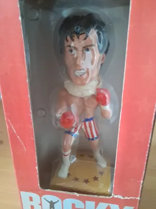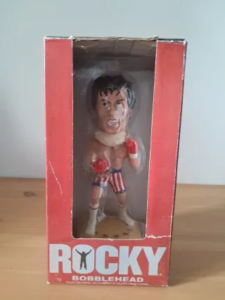 Figura coleccionable de Rocky Balboa, el icónico boxeador 1976 - Collector's Model - Marca Hollywood Collectibles Group - Metro Goldwyn Mayer - Diseño bobblehead edición 2007 - Ropa de boxeador con los colores de la bandera estadounidense. - Base con estrellas.