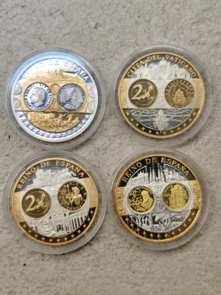 Conjunto de cuatro monedas conmemorativas de plata, dos de España y dos del Vaticano. Cada moneda presenta diseños detallados y acabados de alta calidad. - Dos monedas de España, una con la imagen de Juan Carlos I y otra conmemorativa. - Dos monedas de Ciudad del Vaticano, con diseños de edificios emblemáticos y figuras religiosas. - Diseños intrincados y detalles en relieve.