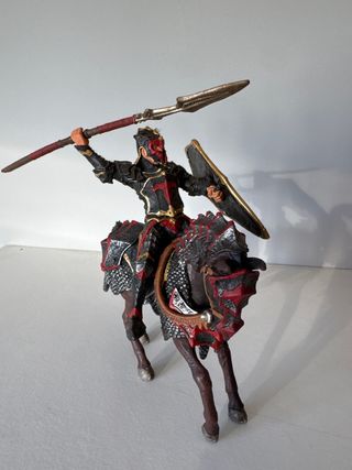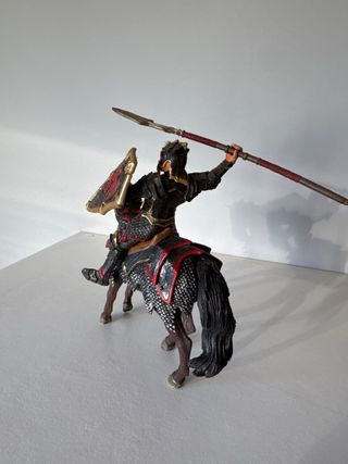 Figura detallada de un caballero medieval montado a caballo, listo para la batalla. - Armadura negra con detalles en rojo y dorado. - Lleva una lanza y un escudo. - Montura ornamentada.