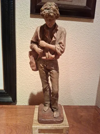 Figura de porcelana vidriada de la casa ceramista Martinu, conocida por sus reproducciones de estilo realista. Pieza original de los años 70. La figura presenta roturas y desperfectos, por lo que se vende para restauración o como pieza decorativa. A pesar de su estado, conserva detalles interesantes propios de la manufactura. Dimensiones: Altura máxima: 31 cm Ancho: 25 cm