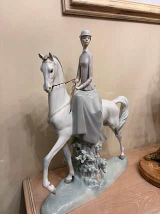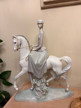 Figura de porcelana de una amazona a caballo de la marca Lladro. Una pieza elegante y detallada. - Diseño clásico de Lladro. - Representación de una amazona montando a caballo. - Base decorativa con motivos vegetales. Medidas 46x35x15. Comprada en los años 70.