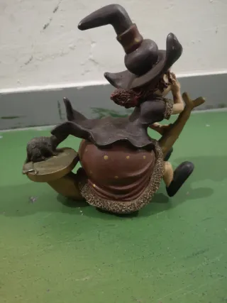 Figura decorativa temática de Halloween. - Diseño de bruja volando en escoba. - Pequeño ratón en la base. - 19cm altura por 16 base
