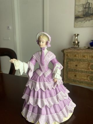 Figura de porcelana de estilo clásico. - Detalle de encaje en el vestido. - Tonos lilas y blancos.