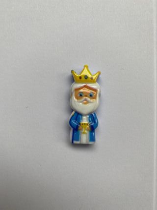 Figura de un Rey Mago, parte de la colección de Mercadona del año 2025. - Corona dorada. - Túnica azul con detalles blancos. - Copa dorada en las manos.