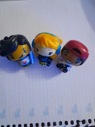 Conjunto de tres figuras coleccionables de Kinder Joy. Cada figura tiene un diseño único. - Figura 1: Personaje con pelo negro y escudo. - Figura 2: Personaje con pelo rubio y auriculares. - Figura 3: Personaje con gorra roja y patinete.