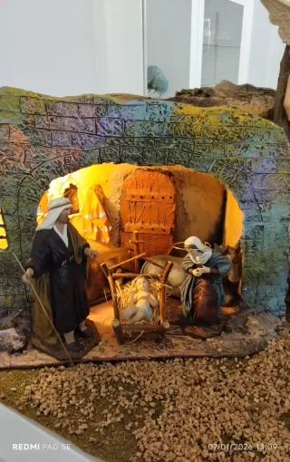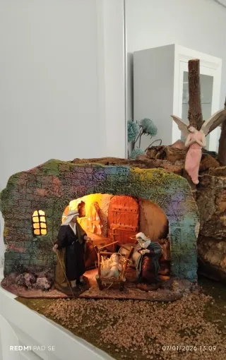 Conjunto de figuras para belén de la marca Ortigas. Representa la escena de la Natividad, estilo Hebreo Serie 701 hecho de terracota pintado a mano y con todos los detalles además de el portal del mismo estilo y año. - Figuras detalladas de alta calidad. - Incluye San José, la Virgen María, el Niño Jesús, la mula y el buey más el Portal. - Escenario de pesebre con detalles rústicos. - La figura de San José tiene 17cm. la Virgen arrodillada 13cm. el ángel 13cm. más la altura de las alas y todos con su aureola metálica dorada, original. - Más en mí perfil.