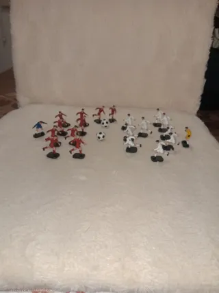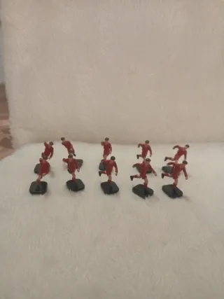 Conjunto de diez figuras de jugadores de fútbol en miniatura, ideales para coleccionistas o para juegos. - Diez figuras de jugadores rojo - Nueve figuras de jugadores blancos y dos porteros - Incluye balones de fútbol.