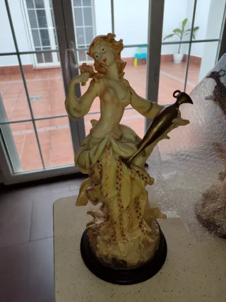 Elegante figura decorativa de una mujer con un pájaro. - Diseño clásico y detallado. - Base redonda oscura.