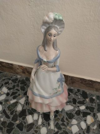 Figura de porcelana de la marca Tengra, con un diseño elegante y detallado. - Figura de mujer con vestido de época. - Detalle de plumas en el sombrero. - Colores blanco, azul y rosa.