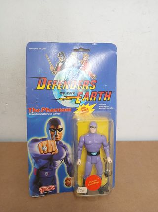Figura de acción de The Phantom de la serie Defenders of the Earth, fabricada por Galoob en 1985 Nueva a estrenar en su blister original Targeta carton con dobleces por años de almacenamiento tal y como está en las fotos - Incluye figura de The Phantom. - Accesorios: Lash-Whip. - Figura articulada con brazos de metal fundido.