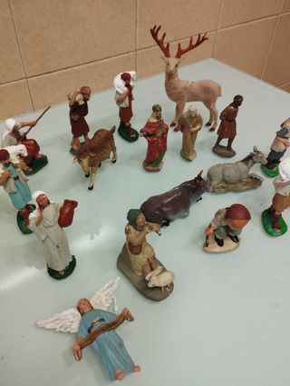 Conjunto de figuras y animales para belén. Algunas figuras son de barro antiguas - Incluye varias figuras humanas. - las figuras miden 9 cm mayoritariamente - Figuras de animales como un rebaño, un buey y un ciervo. - Detalladas piezas para montar tu propio belén.
