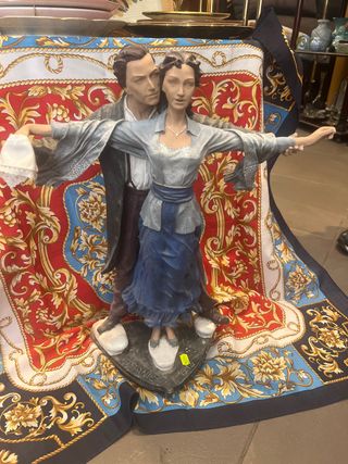 Figura decorativa inspirada en la película Titanic, representando a Jack y Rose en una pose icónica. - Detallada figura de los personajes principales. - Base con el nombre Titanic y el año 1912. - Incluye un pañuelo blanco en la mano de Rose.