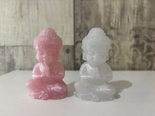 Set de dos figuras decorativas de Buda, perfectas para añadir un toque de serenidad a tu hogar. - Una figura es de color rosa y la otra blanca. - Ambas figuras están en posición de meditación con las manos juntas.