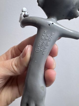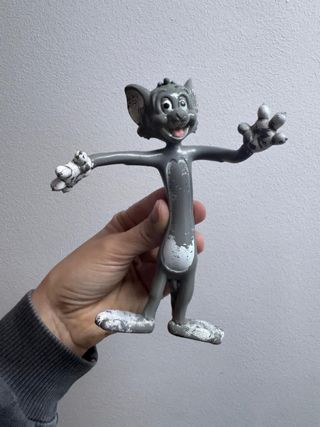 Antigua figura de goma años 80 fabricada en España por Vicma, gato Tom de la serie de dibujos animados Tom y Jerry. Goma con interior de alambre para poder moldearlo. Mide unos 15 cm.